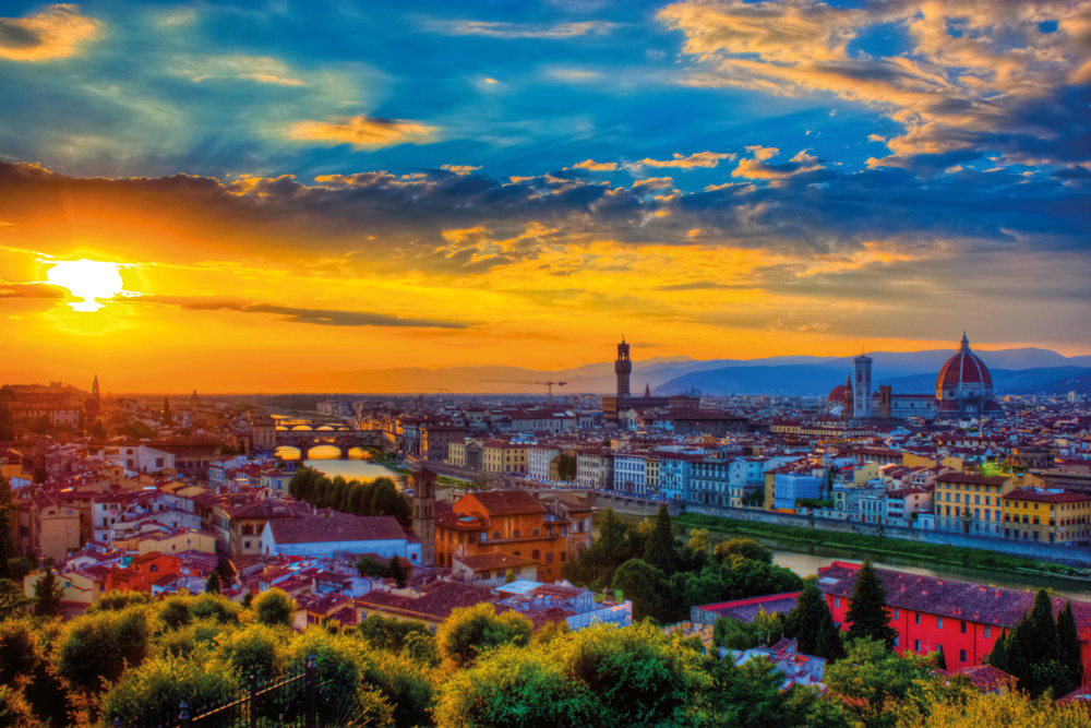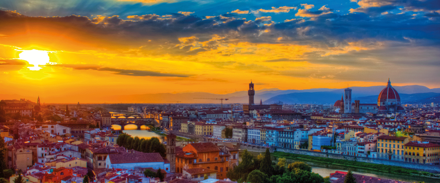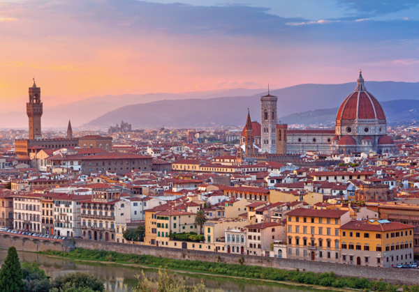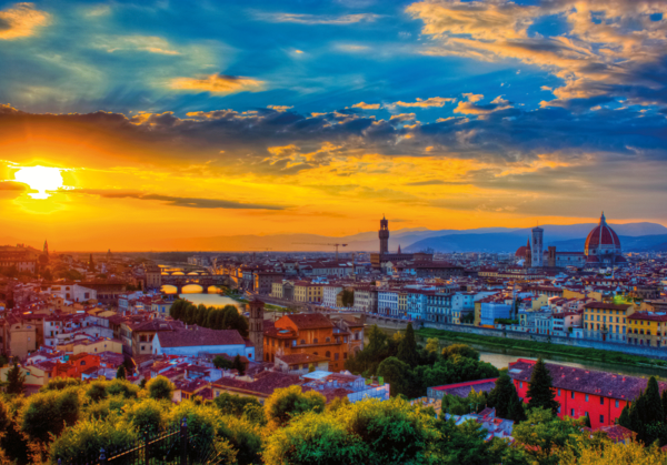 Florenz ist eine der bedeutendsten Städte Italiens und liegt in der Region Toskana. Sie ist die Hauptstadt der Provinz Florenz und befindet sich am Fluss Arno, umgeben von sanften Hügeln und Weinbergen. Florenz ist berühmt als Wiege der Renaissance und war im 15. und 16. Jahrhundert ein Zentrum für Kunst, Wissenschaft und Kultur. Die Stadt ist bekannt für ihre beeindruckende Architektur, darunter die Kathedrale Santa Maria del Fiore mit ihrer markanten Kuppel, die von Filippo Brunelleschi entworfen wurde. Florenz hat eine reiche Geschichte, die bis in die römische Zeit zurückreicht, und war einst die Heimat berühmter Künstler wie Leonardo da Vinci, Michelangelo und Botticelli.