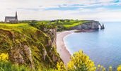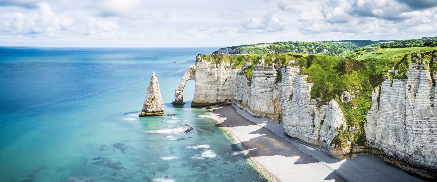 Ihre erste Etappe führt Sie zu einem der beeindruckendsten Naturwunder der Normandie, den majestätischen Kreideklippen von Etretat. Diese berühmten Felsformationen, die die Küste prägen, sind nicht nur ein visuelles Spektakel, sondern auch ein Ort voller Geschichten. Bewundern Sie die drei markanten Felsentore – die Porte d’Aval mit der Aiguille, die Manne Porte und die Porte d'Amont – während Sie entlang der kleinen Straßen der Alabasterküste radeln. Ihr nächstes Ziel ist Fécamp, einst der Hauptstützpunkt der französischen Neufundlandfischer, die von hier aus in die weiten Ozeane aufbrachen. Die Tour endet im charmanten Seebad Saint-Aubin-sur-Mer, wo die bunten Badehäuser einladend auf Sie warten. Übernachtung im Raum Rouen.